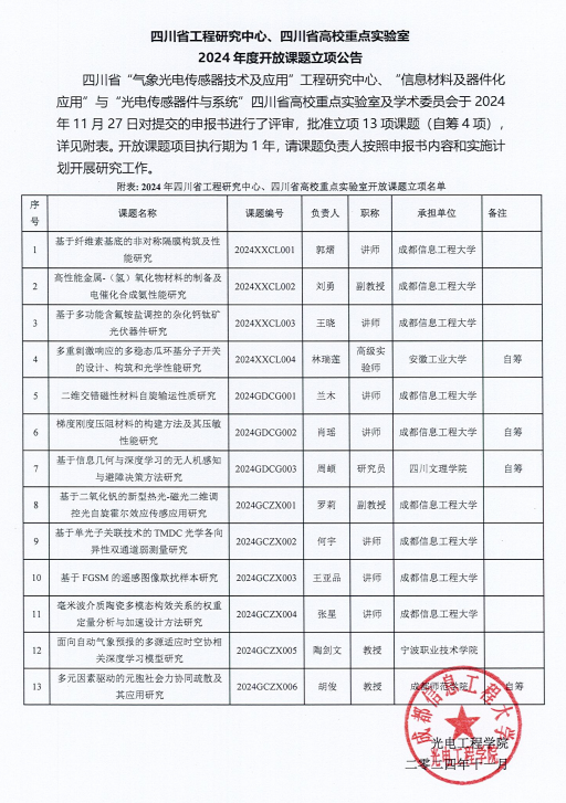 四川省“气象光电传感器技术及应用”工程研究中心、“信息材料及器件化应用”、“光电传感器件与系统”四川省高校重点实验室学术委员会于2024年11月27日对提交的申报书进行了评审,批准立项13项课题(自筹4项),详见附表。开放课题项目执行期为1年,请课题负责人按照申报书内容和实施计划开展研究工作。