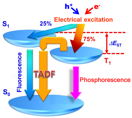 针对传统有机荧光和磷光材料量子产率低、含有贵金属、激子淬灭严重等问题,基于延迟荧光机制,通过分子设计、材料制备、光物理、器件物理以及发光机理等过程,开展新一代有机发光材料与器件的研究。基于不同类型的延迟荧光发光机制,开发出一系列性能优异的新型延迟荧光材料与器件,助推有机发光材料与器件在显示、照明等领域的大规模产业化。