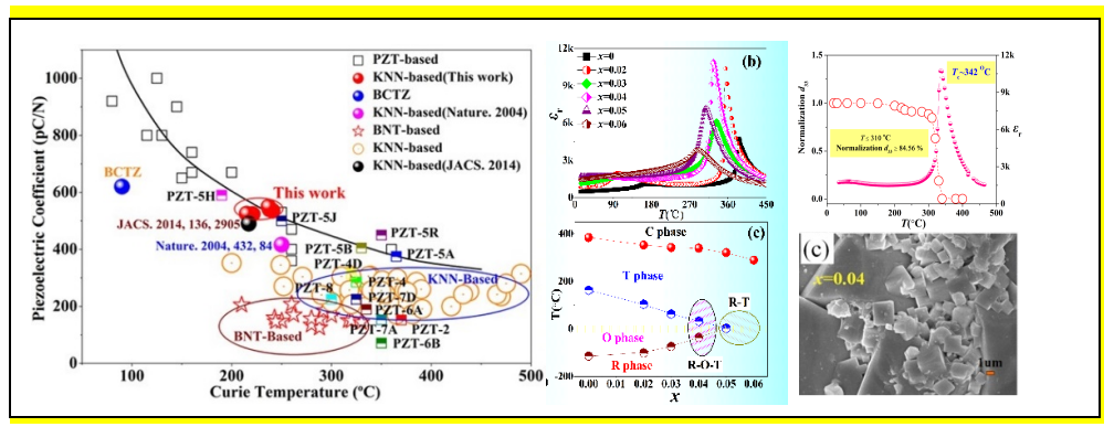● 开发了系列高性能环境友好型压电材料:KNwNSz-xBF-yBNZ材料的压电性能高达550 pC/N,且居里温度仍保持在237 °C,性能接近于铅基PZT-5H材料。为高温应用提供解决方案:发明了一种压电性能大于400 pC/N,同时居里温度大于300 °C的环境友好型三元系KNN压电材料。