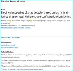 2015级材料物理专业刘一臻同学以第一作者在材料类国际期刊《Materials Research Express》(IF=1.151)上发表题为“Electrical properties of x-ray detector based on bismuth tri-iodide single crystal with electrode configuration considering”的学术论文,报道了采用物理气相输运法生长厘米级尺寸高质量BiI3单晶体,并根据晶体结构的特殊性研制出三种结构的X射线探测器原型,在0.02V/um的超低偏置电压下获得了高达0.526×104uC/Gy/cm2的X射线探测灵敏度和896.4的光电转换信噪比,验证了BiI3材料在X射线探测器领域应用的可行性,并进一步阐明了晶体结构与电极配置对探测器性能的影响关系,对研究新一代环保型X射线探测器具有重要的科学价值和现实意义。论文指导老师孙辉博士为通讯作者,品色堂