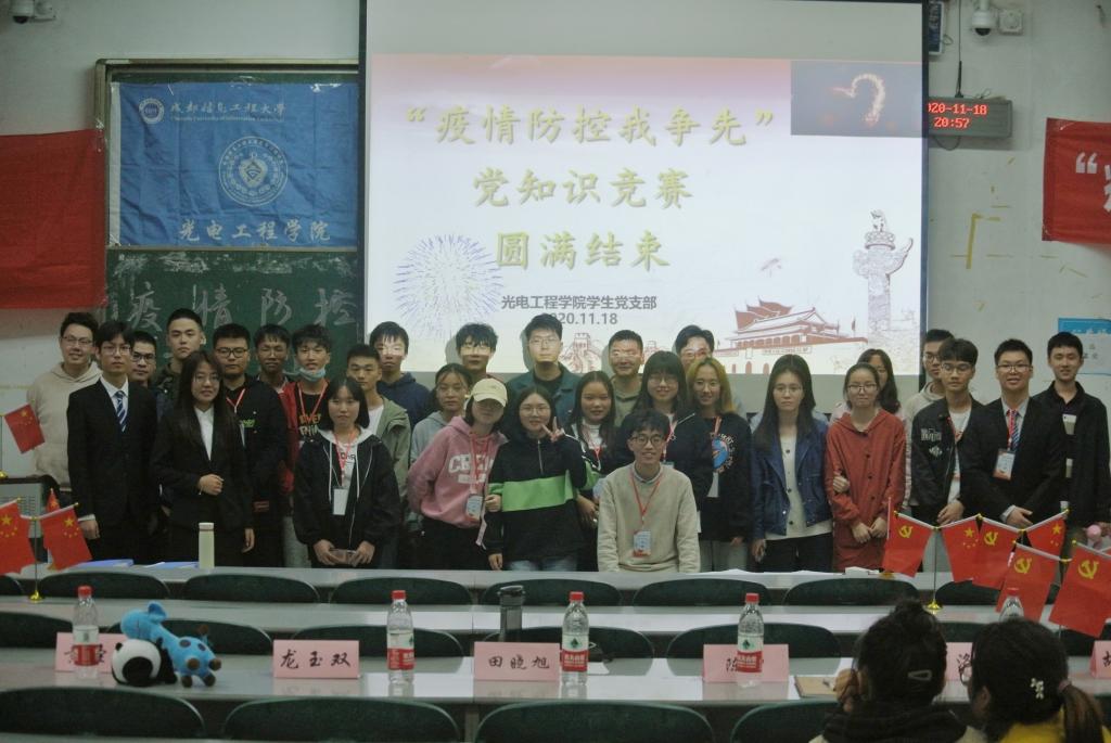 党支部制定了详细计划,反复排练。本次比赛紧扣疫情防控,内容涵盖了党章、党史、党规以及时政。经过近一周的宣传,共有313位同学参加比赛,团体赛报名共92组,个人赛报名共49名。初赛以笔试的形式进行,经过严格的选拔,共有9支团队以及8位个人选手晋级决赛。决赛分为团体赛和个人赛两部分,期间也设有有观众互动答题环节。比赛中各位参赛选手秉持公平公正的原则,各个精神饱满,对答如流,现场掌声不断,充分体现了光电学子力争上游,锐意进取的精神。在互动环节中,观众积极回答问题,无论是参赛选手亦或是现场观众都表现出同学们党政知识的丰富储备。在你追我赶的答题中,比赛接近尾声,35位参赛者均取得理想的成绩,最后,本次比赛所有参赛者及工作人员合影留念。