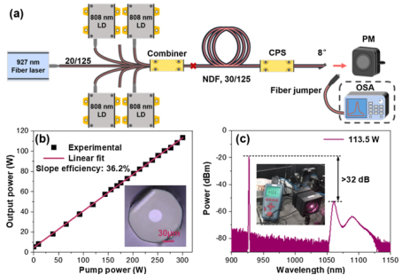 该研究通过配位设计方法创新,成功实现了从材料设计到光纤制备的巨大突破,将全光纤结构的输出功率由瓦级提高到百瓦级,具有里程碑的意义,同时也为更高功率的900nm光纤激光及蓝光激光应用开发打下了基础。