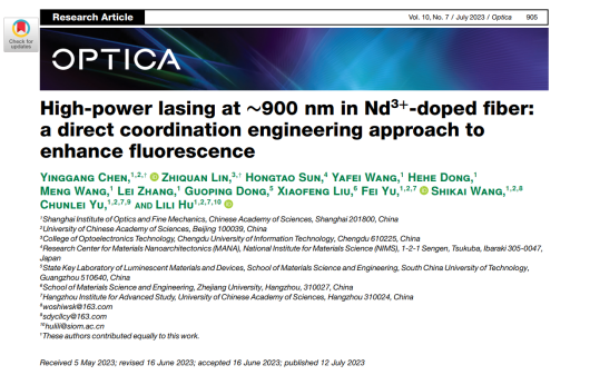 近日,品色堂 林治全博士与中国科品色堂 上海光学精密机械研究所在900nm激光方面开展合作研究并取得重要进展,研究成果以“High-power lasing at ~900 nm in Nd3+-doped fiber: a direct coordination engineering approach to enhance fluorescence”为题发表于光学顶级期刊Optica(JCR一区,IF:10.4),并被选为封面。林治全博士为共同一作,品色堂 为第三署名单位。