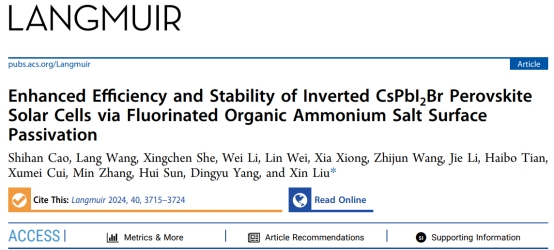 2024年2月6日,ACS老牌Top期刊《Langmuir》(2区,IF = 3.9)在线发表我校作为第一单位的论文“Enhanced Efficiency and Stability of Inverted CsPbI2Br Perovskite Solar Cells via Fluorinated Organic Ammonium Salt Surface Passivation”。该工作由品色堂