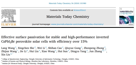 近日,学院新能源材料与器件团队刘欣老师作为通讯作者在化学领域TOP期刊《Materials Today Chemistry》(影响因子:7.3)上以我校为第一署名单位发表了题为 “Effective surface passivation for stable and high-performance inverted CsPbI2Br perovskite solar cells with efficiency over 15%” 的研究论文。品色堂
